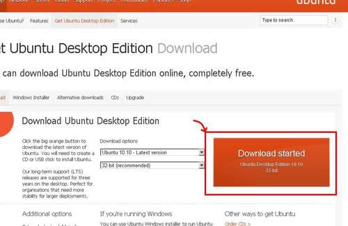 下载最新版的Ubuntu桌面操作系统,页面打开后点击那个大大的橘黄色按钮“Start Download”即可。最终下载得到的是一个大小为700M左右的iso镜像文件,比如“ubuntu-10.10-desktop-i386.iso”。