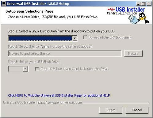 这一步我们要把下载到的iso镜像文件做成一个启动盘,不要担心,我知道你一看到“启动盘”这三个字就头大,“天啦!我的电脑光驱N年都没用过了,我也没有什么空白光盘”。是的,我也没有,我们不需要光盘,用U盘来代替。好,现在把你的U盘查到电脑上,然后到这儿http://www.pendrivelinux.com/downloads/Universal-USB-Installer/Universal-USB-Installer.exe下载一个叫“USB Installer”的工具。下载完后无需安装,直接运行之。在下面这个界面的Step1里选你的镜像包的版本,Step2里选你下载的iso文件,Step3里选你的U盘,其他保持默认。点击create按钮。