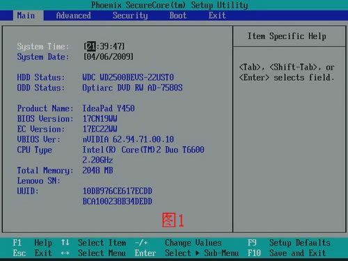 1、开机出现“Lenovo”画面时按“F1”,进入BIOS设置(图1)。