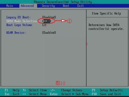 2、重启电脑,按前面的步骤进入BOIS,将SATA工作模式改为AHCI模式(有些则为Enabled或Disabled,不同机型BIOS中硬盘模式修改位置及方法略有差别)。见图10。