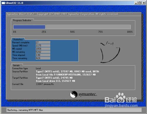 点击之后首先会出现下面这样一个黑色的界面,这就是还原程序,接着就会出现系统还原的进程界面了,上面有详细的说明介绍,剩余时间等等信息全都显示在上面。