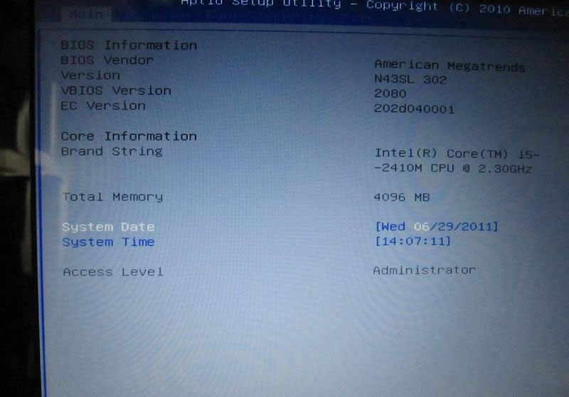 进入bios首先看见的是main选项卡。该界面显示了一台笔记本的一些基本信息