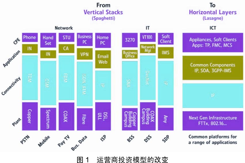 网络转型一定会给固网运营商带来相当可观的网络升级/改造乃至重建的投资,不管是固网运营商还是移动运营商。基于下一代宽带网发展架构,综合已有的投资利用,同时考虑到新型业务的推进速度和市场接受规模以及业务部署和管理能力等诸多因素的分阶段水平型投资模式,将会取代过去垂直型的投资模式,以获得最佳的投资回报(见图1)。