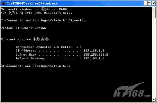 电脑的地址为:192.168.1.xxx,在本例子中为192.168.1.2,如果显示为169.xxx.xxx.xxx,将电脑重启,再在DOS窗口里面运行ipconfig,看IP地址是否获取正确。