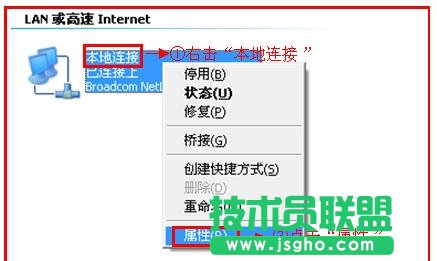 2、鼠标右击“本地连接”—>点击“属性”