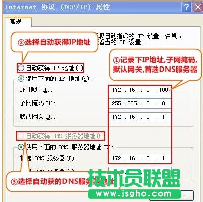 PS:如果之前电脑上是静态IP地址上网,请先记录下电脑上的IP、网关、子网掩码、DNS信息,然后再设置为自动获得,如下图。