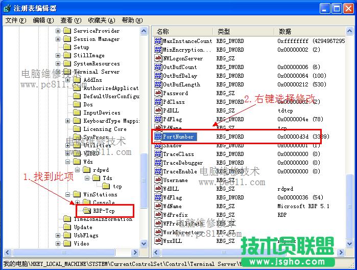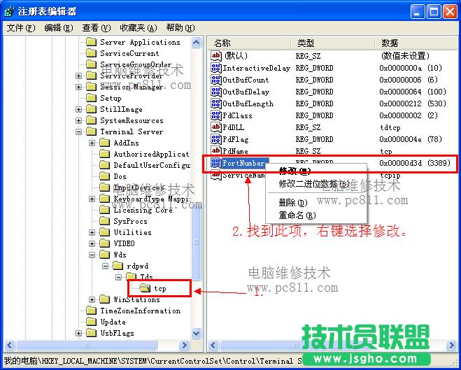 第2步:在打开的注册表编辑器中依次在左侧打开“HKEY_LOCAL_MACHINESYSTEMCurrentControlSetControlTerminal ServerWdsrdpwdTdstcp”,单击左侧的tcp,在右侧找到“PortNumber”项,在此项上右键选择“修改”。
