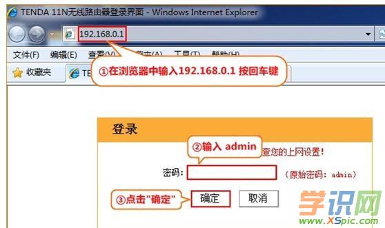 1、登录管理界面:打开你电脑上的任意一款浏览器,在浏览器的地址栏中输入192.168.0.1然后按下Enter键(回车)——>在对话框中输入登录密码(默认是:admin)