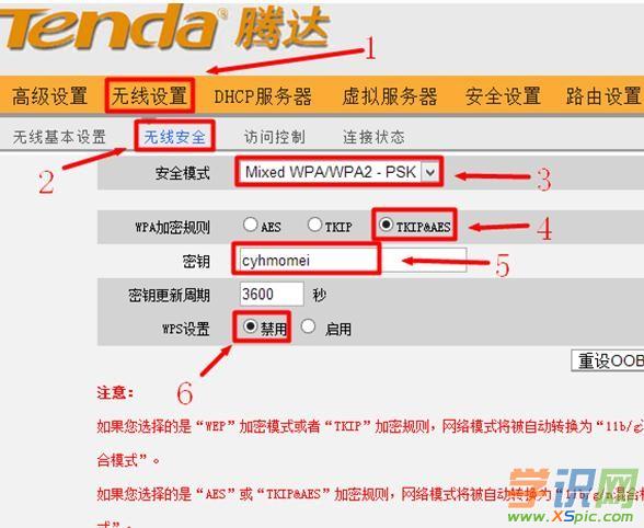 温馨提示:“安全模式”建议用户选择:WPA2-PSK、Mixed WPA/WPAS2-PSK这2项;“WPA加密规则”建议选择:TKIP&AES;“设置”选择:禁用。这样可以保护你的无线网络不会被一些蹭网软件、蹭网卡破解。