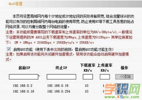 5、将“启用QOS功能”勾选,并在下面填写想要控制的IP地址段(自己电脑的IP地址不要包含在内),再设置好下载速度与上传速度点击“添加”即可将规则添加到路由器中。全部设置好之后点击下面的“保存”即可保存设置