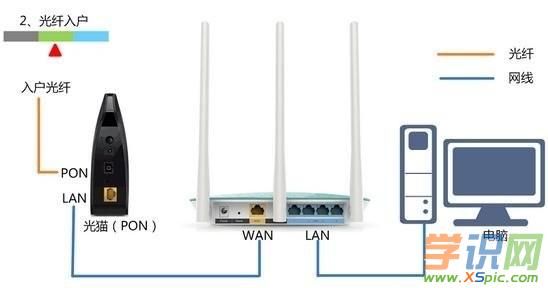 2、光钎上网:请准备2根网线,一根网线用来连接光猫与路由器的WAN接口;另一根网线用来连接路由器上LAN(1、2、3、4)口中的一个与计算机。