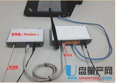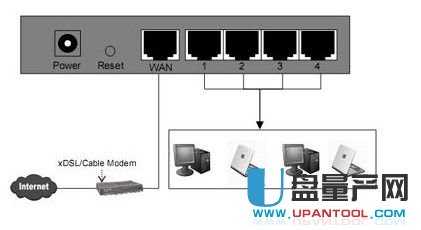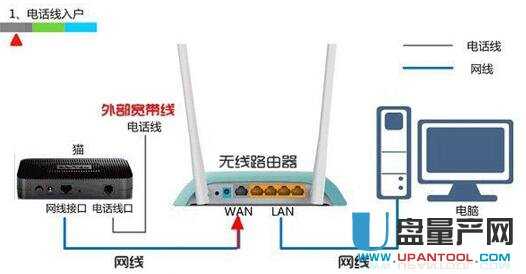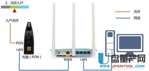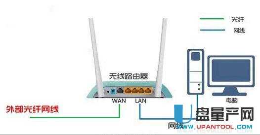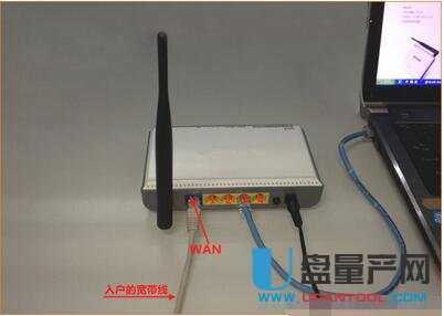 Internet网入口网线与路由器的WAN口连接,再用事先准备好的网线将电脑与路由器的LAN口连接。