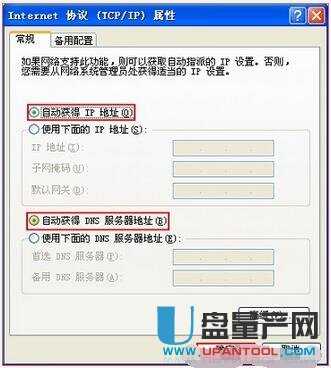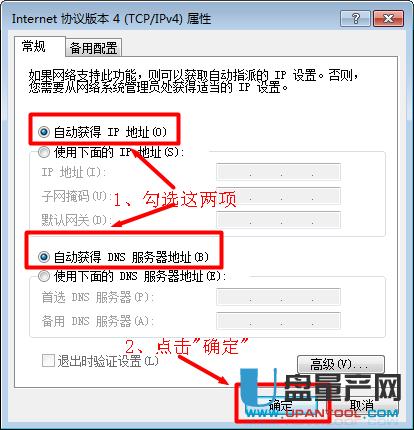 勾选“自动获得IP地址”和“自动获得DNS服务器地址”选项---->点击“确定”。