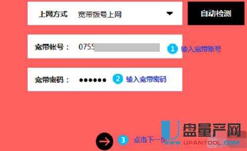 如果你的宽带符合上面介绍的情况,“上网方式”就应该选择:宽带账号——>然后填写“宽带帐号”、“宽带密码”——>点击“下一步”。
