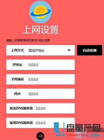 如果你的宽带符合上面介绍的情况,那么“上网方式”就应该选择:固定IP地址——>然后填写:IP地址、子网掩码、网关、DNS服务器地址——>点击“下一步”。