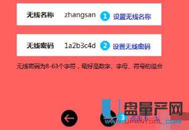 在“无线名称”中设置一个WiFi名称——>“无线密码”中设置一个WiFi密码——>点击“下一步”。