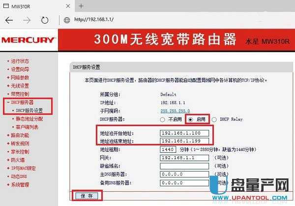 这里一般默认都开启了DHCP服务器,另外默认地址池开始地址:192.168.1.100-192.168.1.199,默认这种设置即可,如果不是此类设置,可以设置这些参数,然后保存即可。