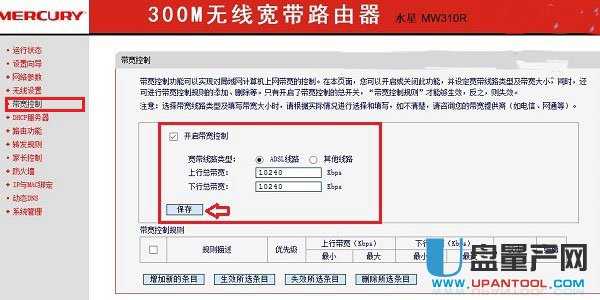 点击左侧菜单中的“宽带控制”在右侧的路由器限速设置中,勾选上“开启带宽控制”,然后选择“宽带线路类型”,一般选择“ADSL线路”,下方的上行总宽带和下行总宽带则根据自家宽带大小填写,完成后,点击下方的“保存”。