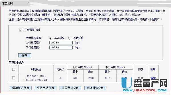 带宽控制功能可以实现对局域网计算机上网带宽的控制。在本页面,您可以开启或关闭此功能,并设定宽带线路类型及带宽大小,同时,还可进行带宽控制规则的添加、删除等。只有开启了带宽控制的总开关,“带宽控制规则”才能够生效,反之,则失效。