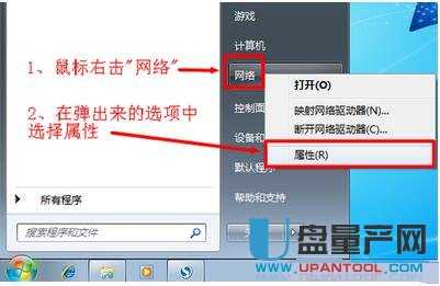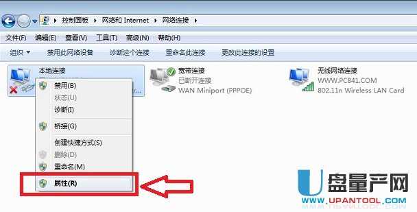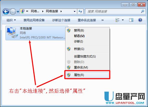 将鼠标放置在“本地连接”上,然后点击鼠标右键,在弹出的选项当中,选择属性