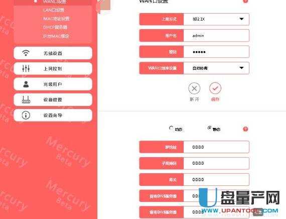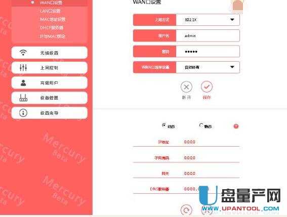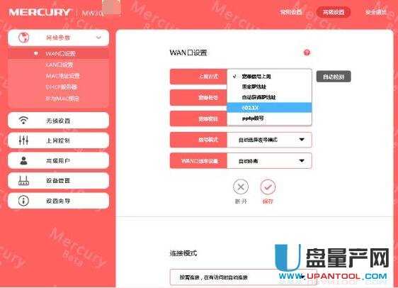 2、上网方式选择不正确:上网方式有ADSL(PPPOE)、动态IP、静态IP这三种,不过家庭用户来说一般都是ADSL上网方式,具体的接入方式请咨询你的宽带运营商,如果不清楚也可以在mercury无线路由器上选择“让路由器自动选择上网方式 ”。
