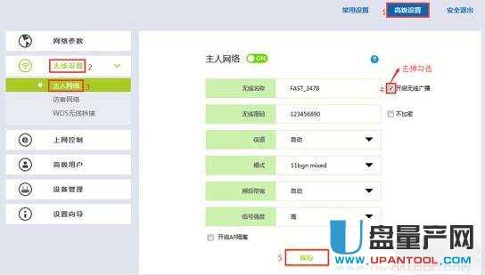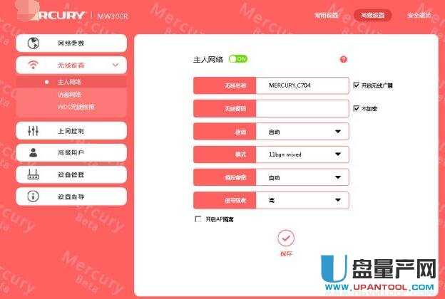 进入mercury路由器设置界面后,选择“高级设置”,找到并点击左侧选择栏里的“无线设置”——>“主人网络”——>去掉“开启无线广播”前的√,最后点击“保存”,即可完成对mercury路由器wifi的隐藏。