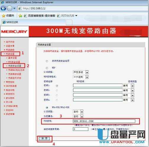 打开mercury路由器管理界面后,依次展开左侧的“无线设置”-“无线安全设置”,在右侧的“无线安全设置”中,找到底部的“PSK密码”,这项就是mercury路由器的无线密码,如要要改密码的话,修改此项即可,修改完成后,要点击底部的“保存”。
