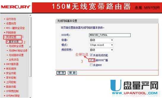 进入到Mercury路由器设置界面后,找到并点击左侧导航栏里的“无线设置”——>“基本设置”,在右侧点击取消勾选“开启SSID广播”,最后点击“保存”按钮。