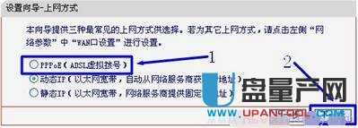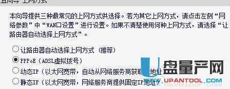 选择上网方式:请根据你的入网方式进行选择,目前国内ISP宽带运营商为普通用户提供的大多数是“PPPOE(ADSL虚拟拨号)”的上网方式。