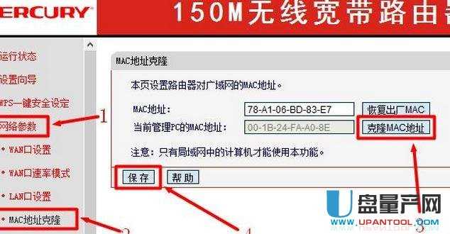 操作方法:用可以拨号的电脑登录到mercury路由器的管理界面---->点击“网络参数”---->点击“MAC地址克隆”---->点击右侧的“克隆MAC地址”---->最后点击“保存”---->重启mercury无线路由器。然后就可以正常的拨号上网了。