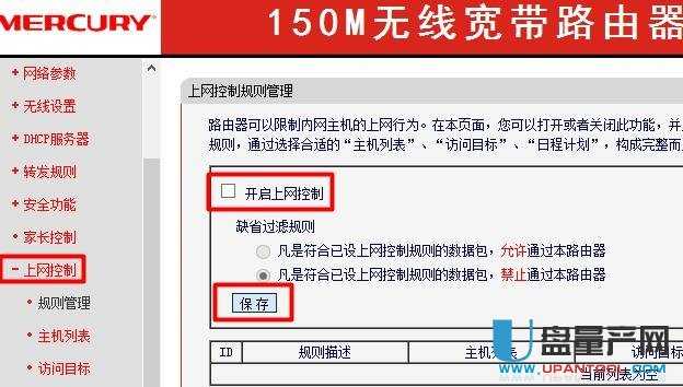 操作方法:在mercury路由器管理界面---->点击“上网控制”---->取消“开启上网控制”---->点击“保存”。
