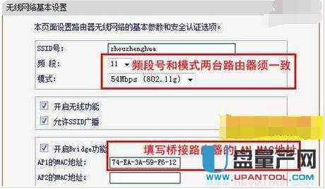 路由器管理界面——无线参数——基本设置 勾选“开启Bridge功能” 在AP1的MAC地址中输入之前记录的对方LAN口MAC地址(两台路由器同样操作)。在频段和模式选项中两台路由器须一致否则无法连接。