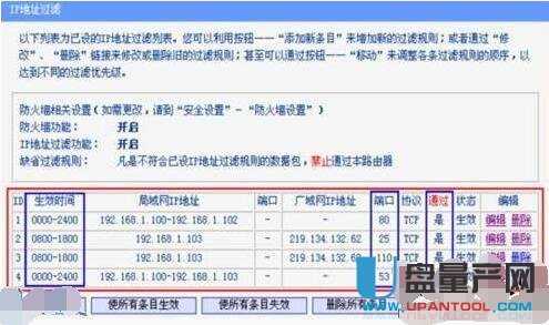 防火墙里的IP地址过滤用于通过IP地址设置内网主机对外网的访问权限,在某个时间段,禁止/允许内网某个IP段所有或部分端口和外网IP的所有或部分端口的通信。