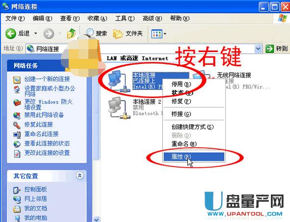 右键点击桌面上的“网上邻居”图标,选择属性,在打开的“网络连接”页面中,右键点击“本地连接”,选择属性
