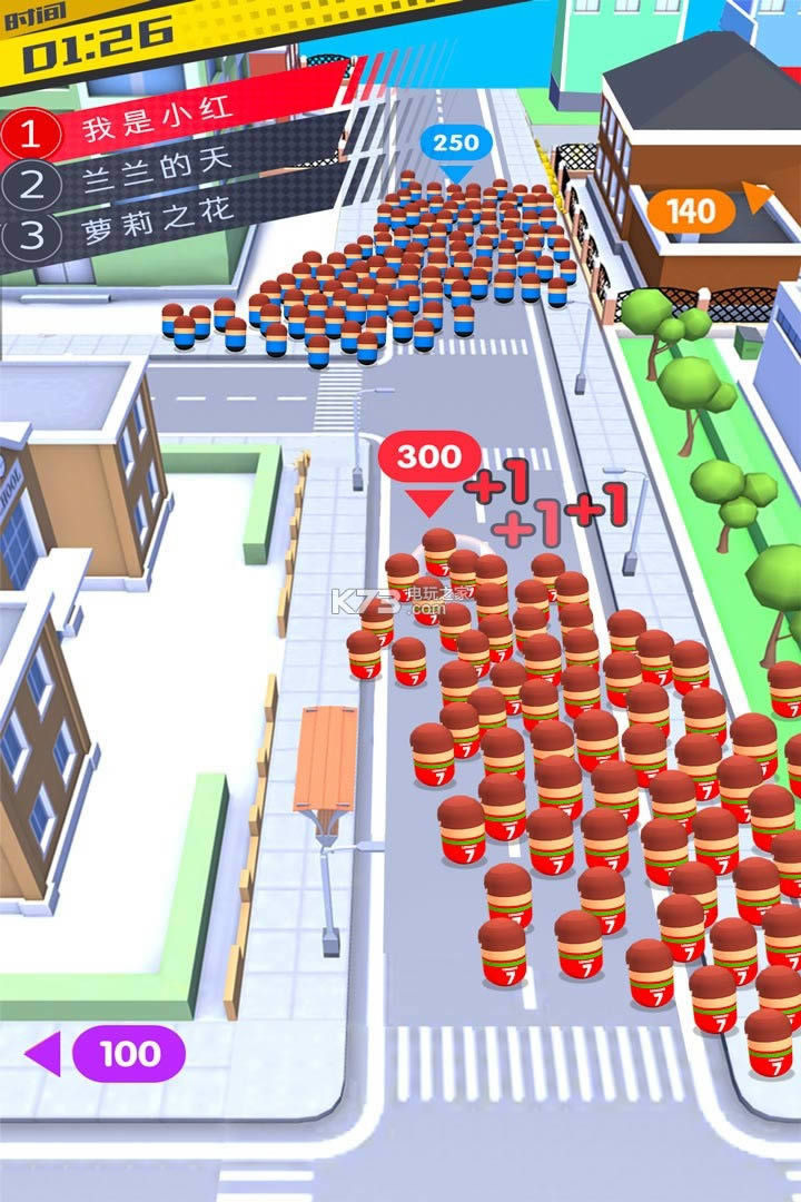 玩家通过操纵火柴人进行移动,吸收更多的人群进入你的队伍,甚至可以将整个街道堵得水泄不通。如果你的人群比对手少,千万不要硬碰硬,记得及时回避。寻找人数少的对手,吞噬他们变得更强,成为压倒性的领袖获取胜利。