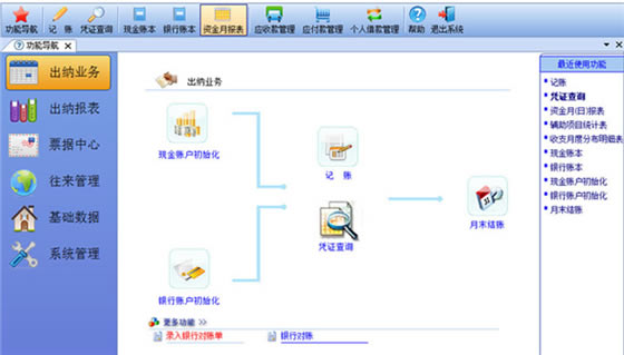 3、自动生成资金月报表、核算项目统计表、经手人统计表、往来单位统计表、部门统计表、费用统计表、收入统计表、银行存款余额调节表。它是国内报表较为丰富的出纳软件。