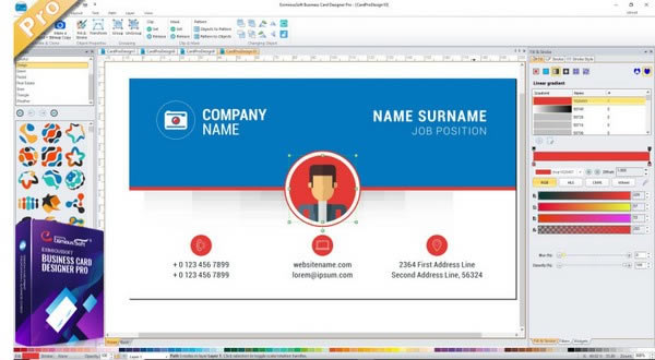 该程序提供了许多由专家设计师预先设计的名片模板。使用它可以轻松快速地开始设计。您可以在名片设计中使用您喜欢的图像、徽标、图形和其他元素来个性化它们。