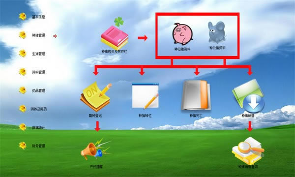 系统功能设计:主要是针对种猪、生猪进行信息化管理。从猪的购进、存栏到配种、繁殖、转栏、死亡到猪销售的各个环节进行管理。另外系统设有 饲料管理、药品管理、数据统计及财务管理,不仅对各项饲养成本进行计算,而且还进行了财务收支管理,是各个养猪厂家的理想选择。