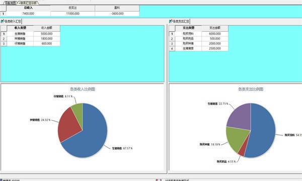 七、财务管理:主要登记养鸡场的财务收入、支出情况,以及财务收支汇总信息。包括:收入明细、支出明细、财务汇总分析。数据采用动态模型图的方式显示,使数据更加直观、清晰,便于管理者更好的做出决策。