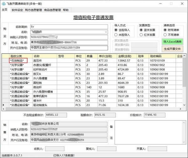 6、可根据企业的在航天或百旺的开票软件中设置的自定义商品信息,对导入的开票清单实现自动赋值税收分类编码。
