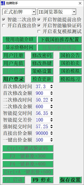 二 助手分正式拍牌和模拟练习两个模式,由于电脑配置和网络不同,助手设置的时间和价格会有差异,请自行模拟练习找出适合自己电脑出价的优先设定参数;