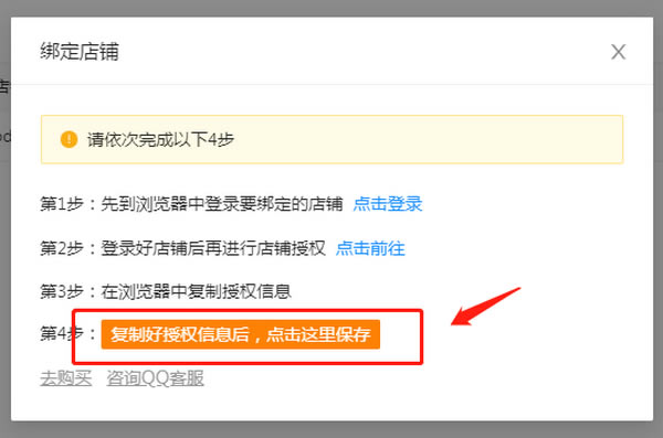 4.登陆店铺后点击弹窗中的点击前往,在浏览器中复制授权码