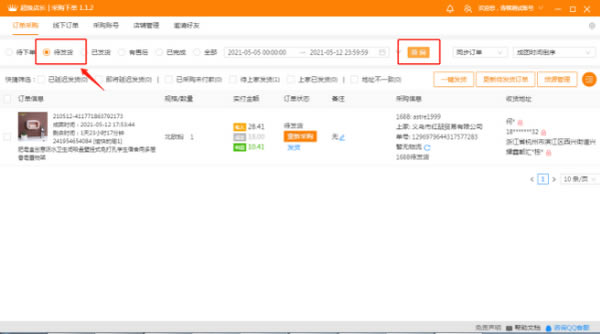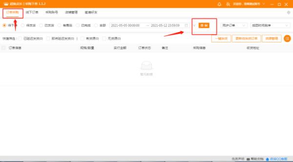 2.点击【查询】按钮,查询出待下单的订单,待下单表示拼多多买家已付款而您还没有在系统中采购的订单