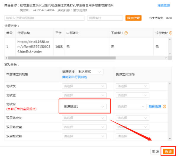 7.在【SKU关联】中,将货源链接与商品SKU关联起来,然后点击确定完成关联