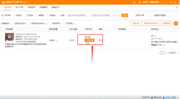 8.再回到【订单采购】页面,点击订单旁边的【下单采购】按钮打开采购窗口