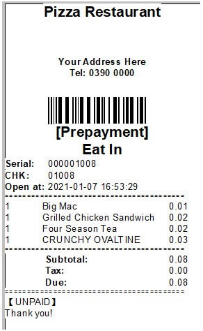 2、下单完成后,自助机打印预结单或结账单,如下,携带小票到收银台付款或等待取餐