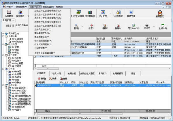 根据用户录入的合同信息及收付款情况,在“报表中心”里会自动生成各种所需的统计报表,包括按合同、客户、部门、合同类别及项目的应收应付汇总表;业务员业绩汇总、商品采购汇总、商品销售汇总、收付款明细报表、收发货明细报表、日回款报表和业务到期提醒。