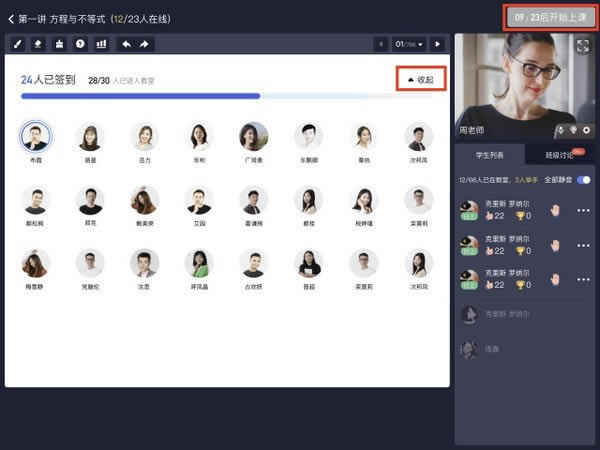 在上课前开启签到功能,可以实时看到一共有多少同学购课,有多少同学来上课签到,提前了解课堂情况。