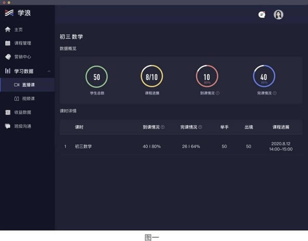 老师可在学习数据界面,对学生的学习情况一目了然,在同一课程下的学生的学习进度和学习效果可以直观表现出来。
