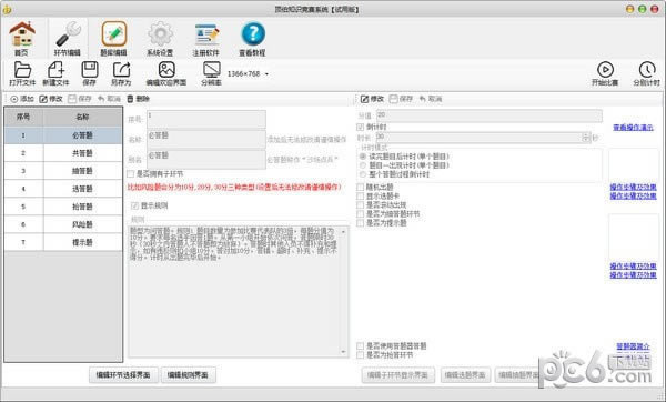 比赛环节可根据比赛项目来具体设定,比赛环节底下可以设置子环节,题目是否随机、是否需要显示选题卡、是否需要倒计时、是否需要显示规则、是否为抢答环节均可由用户根据比赛情况自由设定。